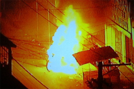 Uma moto foi incendiada pelos criminosos dentro da favela, numa tentativa de despistar os agentes. O fogo atingiu fiações elétricas.